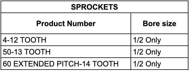 Suggested applications: Use these sprockets when a bed of rollers must turn while moving. Sprockets may be inserted into any standard bushing with a 3/4” HEX bore. The opposite end of the roller uses a standard 1/2” bore bushing. Roller chains run over each sprocket, turning at the desired speed. The speed of rotation can be adjusted.